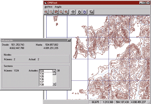 Figure 5: CVSTest. Contours and rivers can be seen on the map, corresponding to two different CVS files. Sectors for the current level of the contours file are displayed in blue. An information window (floating on the map) shows data about levels and sectors being used.