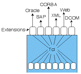 Figure 2: Tcl can also be used as a platform for integration: Extensions connect the Tcl interpreter to various resources, then Tcl scripts can be written to coordinate the resources and extend their facilities.