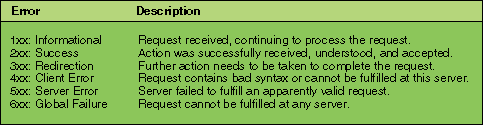 Table 2: SIP errors are divided into six logical classes. Applications can determine the type of error by examining the first digit of the error. The remaining digits (xx) may be used for additional analysis.