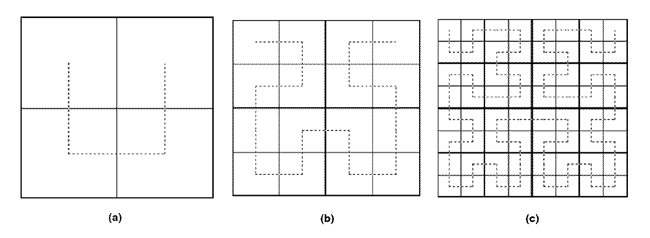 Figure 2: (a) First approximation of the Hilbert curve; (b) second approximation of the Hilbert curve; (c) third approximation of the Hilbert curve.