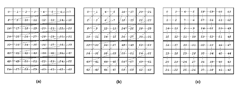 Figure 3: (a) Spatial keys based on row order; (b) Morton keys; (c) spatial keys based on the Hilbert curve.