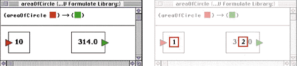 Figure 2: The final function form for areaOfCircle. In this form, there is a line through the middle that separates the form into a top part and a bottom part. The top part defines the representation of all instances of the form and defines the computations for such instances. We interpret the syntactic representation at the top as defining areaOfCircle to be a function of one parameter, identified by the left marker, and returning a single value, identified by the right marker.