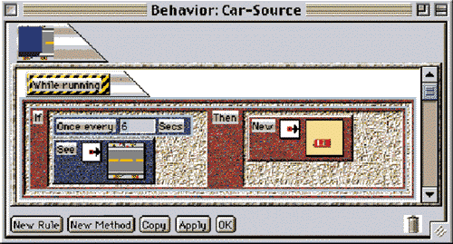 Figure 5: The behavior of the downloaded Car-Source agent specifies that a new Car agent is going to be produced on its own right, once every six seconds, provided there is a piece of road in that direction.
