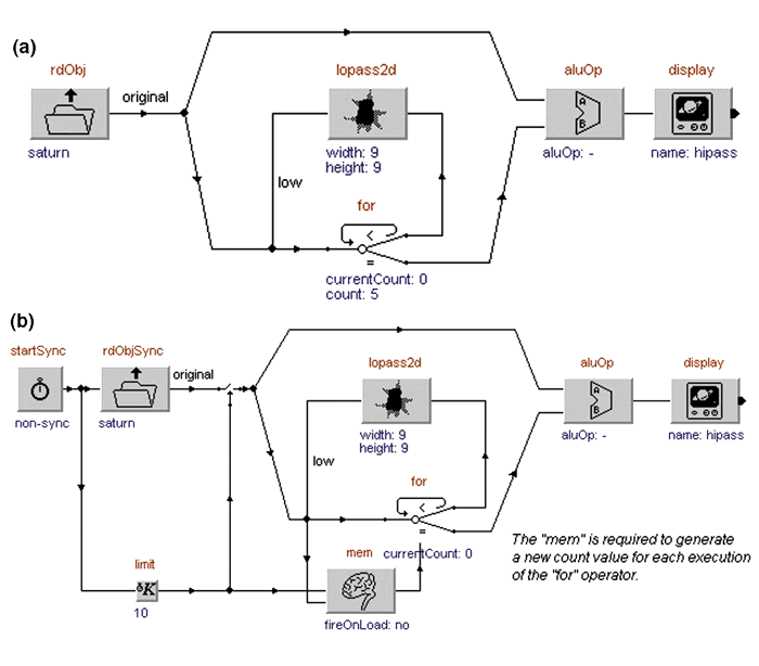 Figure 4: (a) Control structures can be realized in WiT; (b) since the visual programs are dataflow based, this can sometimes become complicated.