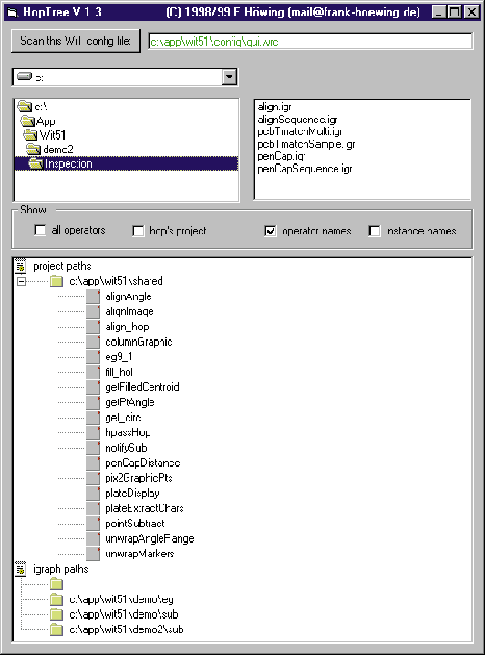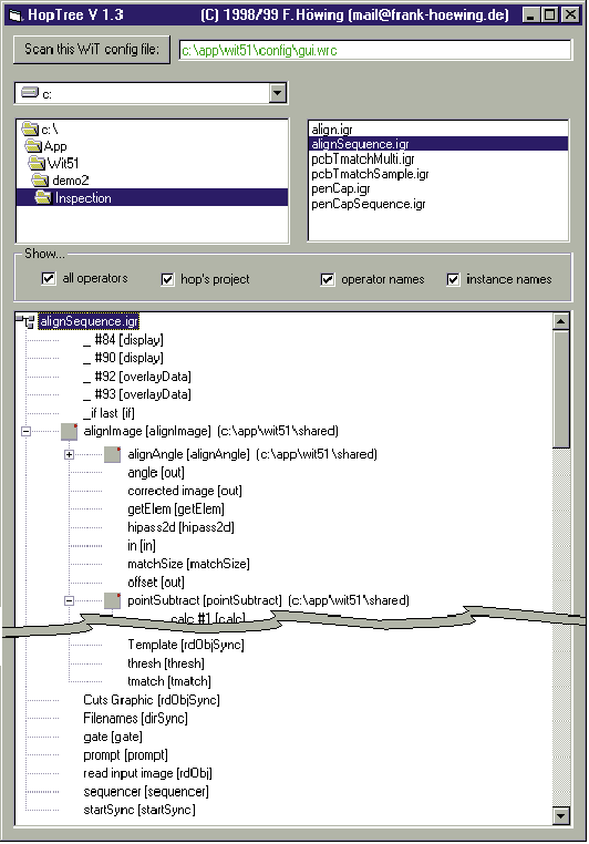 Figure 7: (a) The HopTree tool visualizes the hierarchical structure of visual programs; (b) reports any missing files; (c) lists all projects and their related operators.