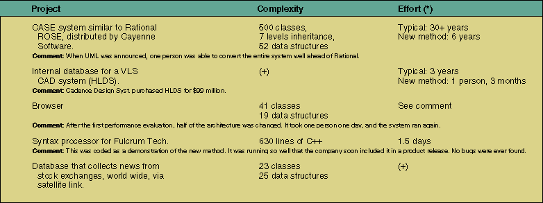 Table 1: Examples of the new method in use in some complex systems. (*)= Total effort from concept to the release of the tested product. (+)= Proprietory information or information not available.