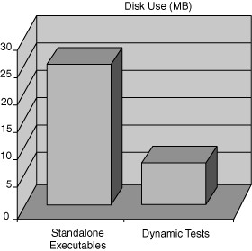 Figure 4: Disk use for the same 21 test programs, again standalone versus dynamic tests.