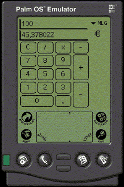 Figure 1: Palm OS Emulator showing Euros and Dutch guilders. The emulator has its country setting to the Netherlands, hence the comma for a decimal point.