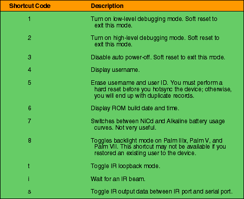 Table 1: Hidden shortcuts for debugging. Shortcuts are activated using the following grafitti strokes: script "el," dot, dot, <shortcut code>.