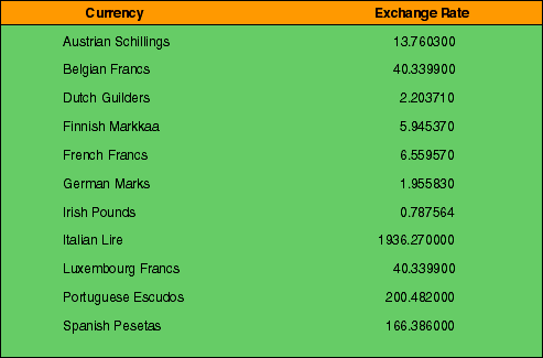 Table 2: Currency rates for one Euro. The rates do not fluctuate within these 11 countries.