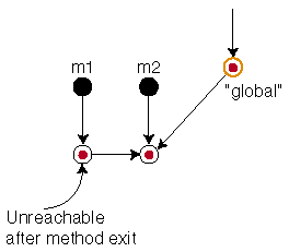 Figure 1: A method with two local references on the stack, m1 and m2.
