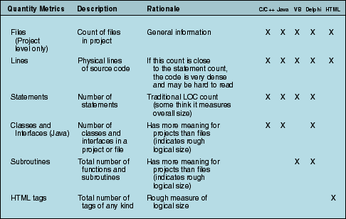 Table 1: Quantity metrics.