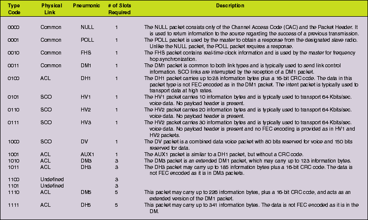 Table 1: Packet types by physical link.