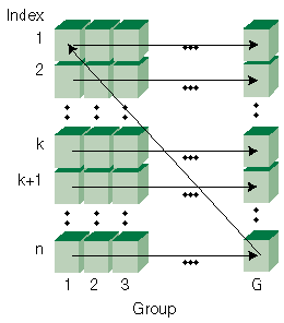 Figure 2: Transmission order: Any k blocks must be received from each group to reconstruct the transmitted file. To minimize receive time, one block is sent from each group in turn. While sending a given index value, the group order may be randomly varied to avoid correlation of periodic losses. G, the number of groups, is the ceiling of the file size divided by k.