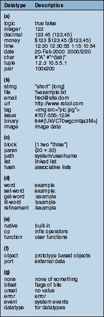 Table 1: Primary REBOL datatypes. (a) Numerical datatypes; (b) character datatypes; (c) block datatypes; (d) word datatypes; (e) function datatypes; (f) object datatypes; (g) special datatypes.