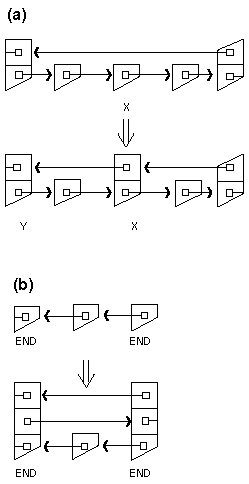 Figure 3: (a) Raising X, the middle of three nodes in a row (may leave X or Y as a middle node); (b) raising the END node. [Cases not shown are analogous to (a).]