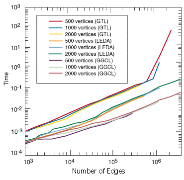 Figure 2: Performance comparison of the BFS algorithm in GGCL with that in LEDA and GTL. Every curve represents a graph with a fixed number of vertices and with a varied number of edges.