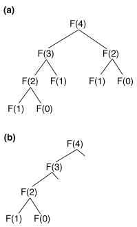 Figure 1: Computation tree for F(4) without (a) and with (b) reusing previous results.