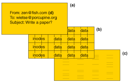 Figure 2: Simplified picture of files as seen by: (a) users and applications; (b) file-system software in the operating system; (c) hardware.