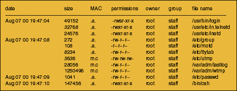 Figure 1: Output of the "mactime" tool on a SunOS system.
