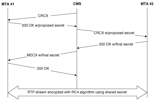 Figure 5: The CMS facilitates the negotiation of the shared secret between the MTAs. Once the secret is established, the RC4 algorithm is used to encrypt the contents of the RTP stream.