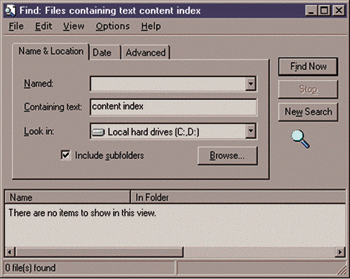 Figure 1: Searching for all files containing text "content index" on local hard drives using the "Find Files" dialog.