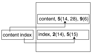 Figure 2: The resolution of the phrase query, "content index." The entries in the index contain words followed by lists of document numbers and positions. For instance, the word "content" occurred in document 5 twice, at offsets 14 and 28. Since the word "index" also occurred in document 5 at offset one larger than that of "content," we have a hit.
