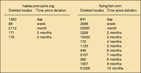 Table 2: Number of surviving inode (file attribute) blocks as a function of time since file deletion for UNIX home directory and system partitions. hades.porcupine.org is Wietse Venema's FreeBSD workstation. flying.fish.com is Dan Farmer's RedHat Linux workstation. In both cases, the history of deleted file attributes goes back until the time when the filesystems were created.