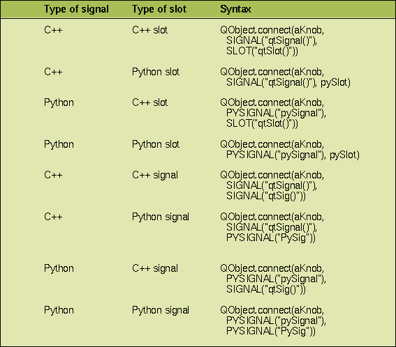 Table 1: C++ slots, Python functions, and other signals.