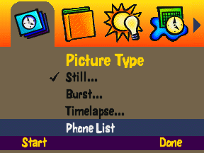 Figure 1: The Picture Type menu that appears on all Kodak cameras running Digita with the Phone List script added.