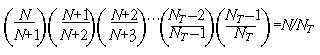 What about the survival probabilities for records chosen after the first N? It is easy to see that the last record is chosen with probability N/NT. We can see that the record at the next-to-last position in the file is chosen with probability N/(NT-1), but it must survive being knocked out by the last record. The probability of the last record being chosen and knocking out the next-to-last one is (N/NT)(1/N)=1/NT. The probability of that not happening is 1-1/NT=(NT -1)/NT, which means that the probability that the next-to-last record in the file will be chosen and will survive is: