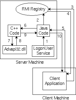 Figure 1: Execution sequence. 1. The LogonUser service calls the Java class that handles user authentication requests. 2. The Java code registers an instance of itself with the RMI registry, so any machine can try to log a user onto a site using the network. 3. A client application needs to use the LogonUser object. 4. The registry returns the object. 5. Now, the client can conceptually talk directly to the Java code on the server. It sends a username and password. 6. The Java code, through JNI, calls platform-dependent C++ code to authenticate the user. 7. The C++ code calls the LogonUserA Windows API function in Advapi32.dll. 8. LogonUserA returns True or False to the C++ code. 9. The C++ code returns True or False to the Java code. 10. The Java code returns True or False to the client.