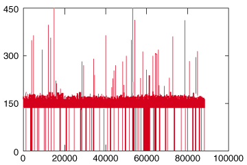 Figure 5: Delay trace from a round-trip delay measurement between Helsinki (Finland) and Ottawa (Canada) made on the Internet, December 1999. Y-axis indicates round-trip delay (in milliseconds), and x-axis indicates sequence number S1. Zero delays are packet losses.
