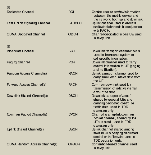 Table 3: The physical layer provides two different types of transport channels. (a) Dedicated Transport Channels types; (b) Common Transport Channels types.