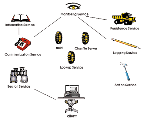 Figure 1: A djinn of clients and services supported by the RMI activation daemon, a classfile server, and a Jini lookup service. Clients and services find each other through the lookup service and communicate through granular interfaces. Lines represent associations between services.