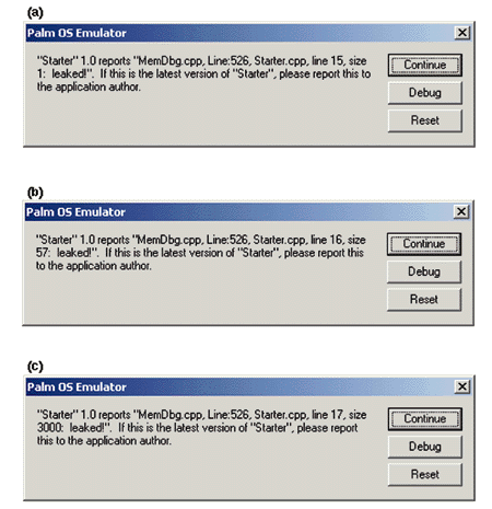 Figure 2: When running the code shown in Figure 1 on the Palm OS Emulator, we get the following three debug boxes in the CheckForLeaks() call: (a) detection of LeakedClass; (b) detection of leaked MemPtrNew call; (c) and detection of leaked MemHandleNew call.