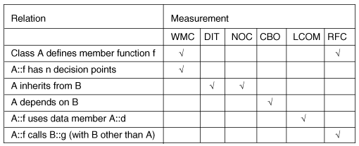 Figure 3: Measurements and relations; a tick means that the measurement named in the column depends on the relation named in the row.