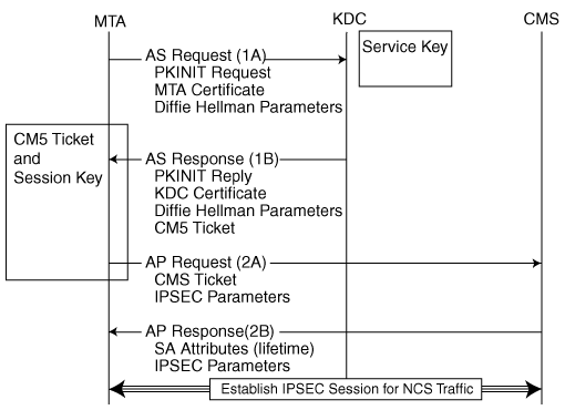 Figure 3: The asymmetric PKINIT exchange minimizes the amount of messages required to establish an IPSEC Security Association between the CMS and MTA.