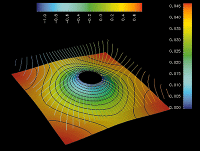 Figure 7: Typical eigensolution (dm=0.2, dn=0.1). The absolute value of the amplitude is shown as a surface plot (right color bar). The phase is shown as superimposed contours (horizontal color bar). Plot obtained using openDX.
