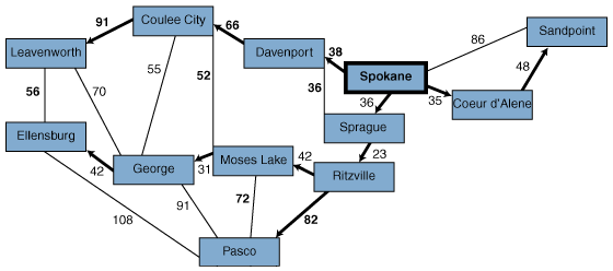 Figure 4: Single-source/shortest-paths spanning tree (Dijkstra's algorithm) gives the shortest paths from the starting point to all other nodes.