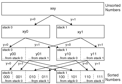 Figure 3: Successive distributions of values in the radix sort. The values are scanned from left to right and distributed into the stacks.