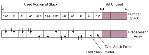 Figure 4: The shared stack method. Using a predecessor array, you share an array amongst multiple stacks. Here, only two are shown. Stack pointers are used to maintain the top of each stack, and the predecessor array maintains the link to the predecessor, on each stack, of every item pushed onto the stacks.