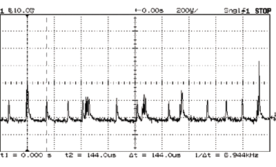 Figure 3: When it's turned off, the Visor wakes up every 2 ms. The peak current hits 100 mA, but the tiny duty cycle reduces the average current to less than 0.5 mA.