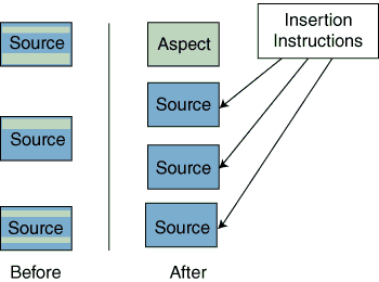 Figure 1: Pulling out related code from many files and putting it in one place, along with instructions on how to reinsert it at either compile or run time.