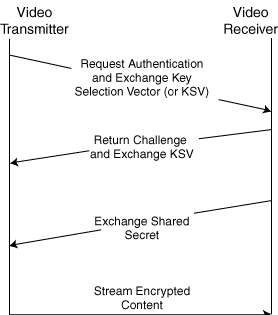 Figure 1: Authentication process for HDCP. Video sender exchanges keys with a receiver. If the exchange succeeds, a shared key is established between the two parties to encrypt content.