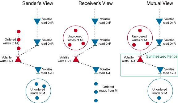Figure 1: Three different viewpoints of how Example 1 executes in .NET when R is declared volatile. The mutual view shows what the sender and receiver have promised each other. Two of the "diodes" form a fence (green) that separates writing of M from reading of M.