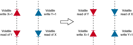 Figure 2: Volatile reads and writes are not guaranteed to be sequentially consistent in .NET. The compiler or hardware may reorder the events on the left so that they occur in the order on the right. In sequential consistency, it would be impossible (on the left side) for both reads to precede both writes.