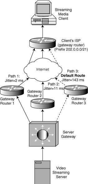 Figure 1: Typical multihomed streaming video network showing jitter along each potential path.