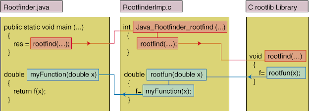 Figure 2: At run time, Java calls C interface, calls C rootlib library, calls C interface, calls Java.