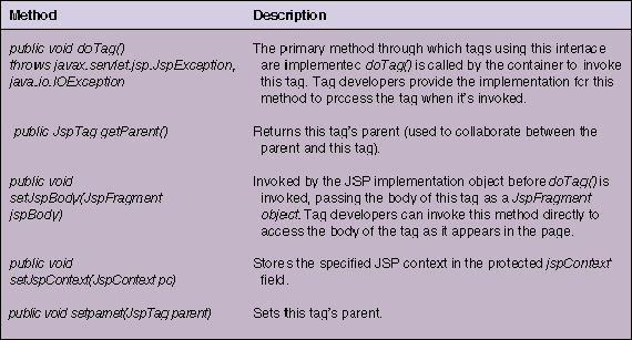 Table 2: javax.servlet.jsp.tagext.SimpleTag interface.